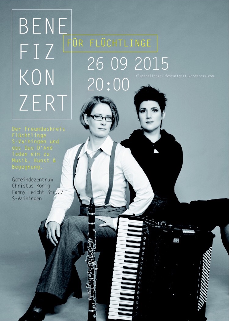 Für ein Benefizkonzert von D’Ané spenden Stuttgarter Künstler Ihre Werke, die in diesem Rahmen zum Verkauf angeboten werden (sie werden auf dieser Seite vorgestellt: https://fluechtlingshilfestuttgart.wordpress.com/). Der Erlös fließt zusammen mit den Konzerteinnahmen zu 100% an die Hilfe für Flüchtlinge.
