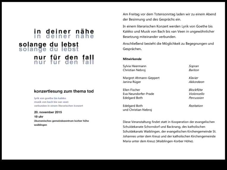 Konzertlesung in Waiblingen: 20.11.2015, 19 Uhr November 6, 2015 | janinarueger Teilen Sie dies mit:Teilen Auf Facebook teilen (Wird in neuem Fenster geöffnet) Facebook Auf X teilen (Wird in neuem Fenster geöffnet) X Gefällt mir Wird geladen …